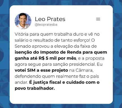 Leo Prates celebra aprovação de ampliação da faixa de isenção do IR na Câmara